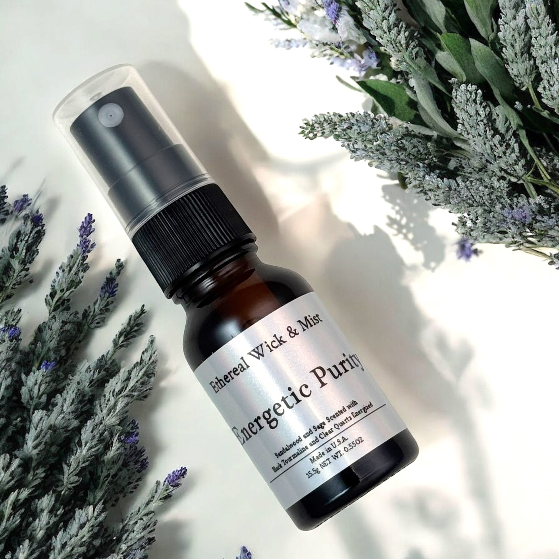 "Energetic Purity" Energy Mist is Infused with the protective energy of Black Tourmaline and the clarifying power of Clear Quartz, this mist blends the purifying essence of sage with the grounding yet uplifting warmth of sandalwood. Sage clears stagnant energy and negativity, while sandalwood fosters deep tranquility, elevates spiritual energy, and restores balance. Together, they create a sacred mist that refreshes your space, shields your aura, and invites clarity, protection, and harmony.